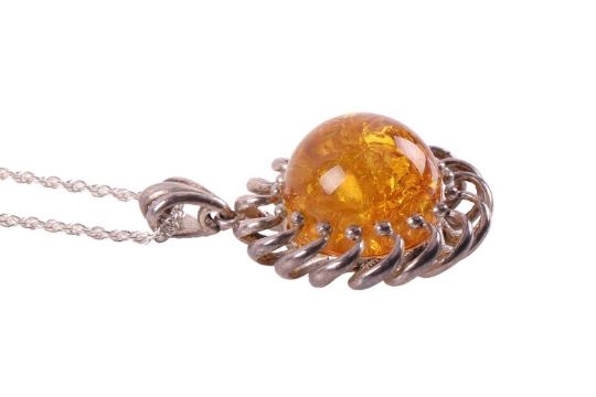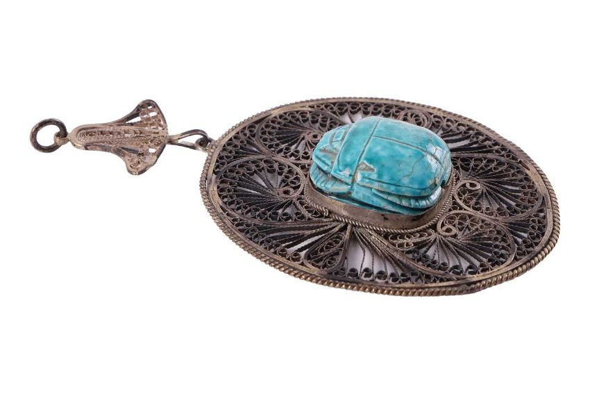 A group of jewellery to include; a 9ct tie clip with lovers knot motif, measuring 7.2 x 1.cm, with British hallmarks, weight 4.4 grams; an Yves Saint Laurent heart-shaped brooch pin designed by Robert Goosens; an abstract brooch signed Edouard Rambaud Paris, together with a large white metal filigree and faience scarab pendant; an amber pendant suspended from a rope chain, stamped "925", weight 6.8 grams; and a smaller amber pendant in unmarked white metal. (6)