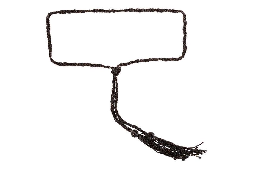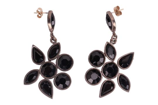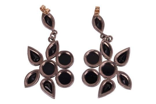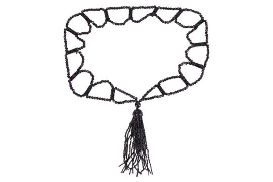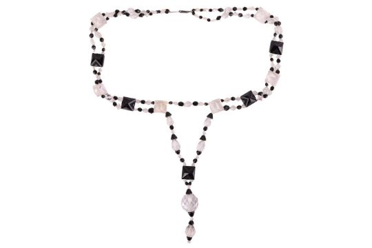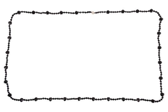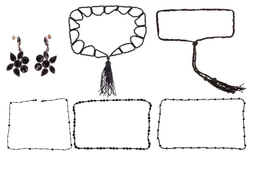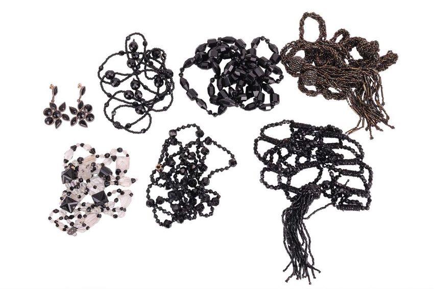 A group of costume jewellery, including a pair of jet flower earrings, set in silver-plated pewter, a black bead chain of ladder design, completed with a beaded tassel, 102cm in length, a black beaded necklace comprising a single row of mixed form geometrical beads, 124cm in length, and others, gross weight 449.3 grams (6).
