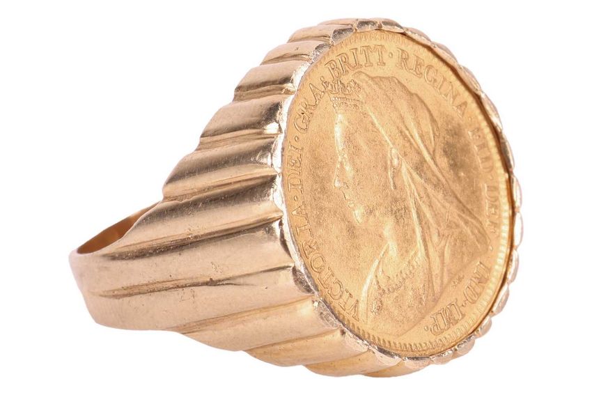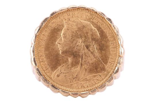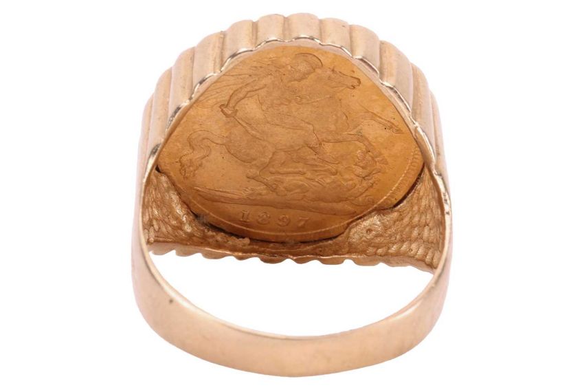 A Victorian half sovereign tartelette ring, dated 1897, set to a ring mount with tapering shank in 9ct gold, British assay marks, size V, 8.4 grams.