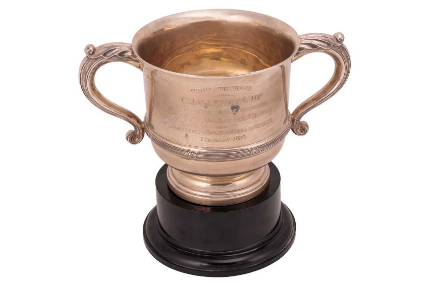 A silver East Surrey Regimental Point to Point Challenge Cup, hallmarked Sheffield 1927, the two-handled trophy cup of circular form with reeded band to belly featuring foliate detailing, with leaf-capped scroll handles, with presentation inscription by 'Major General Sir John R. Longley, K.C.M.G, C.B' on ebonised based, 32.0 cm wide (with handles); total weighable: 1104.17 grams (35.5 ozt)