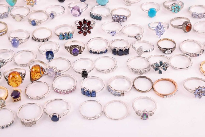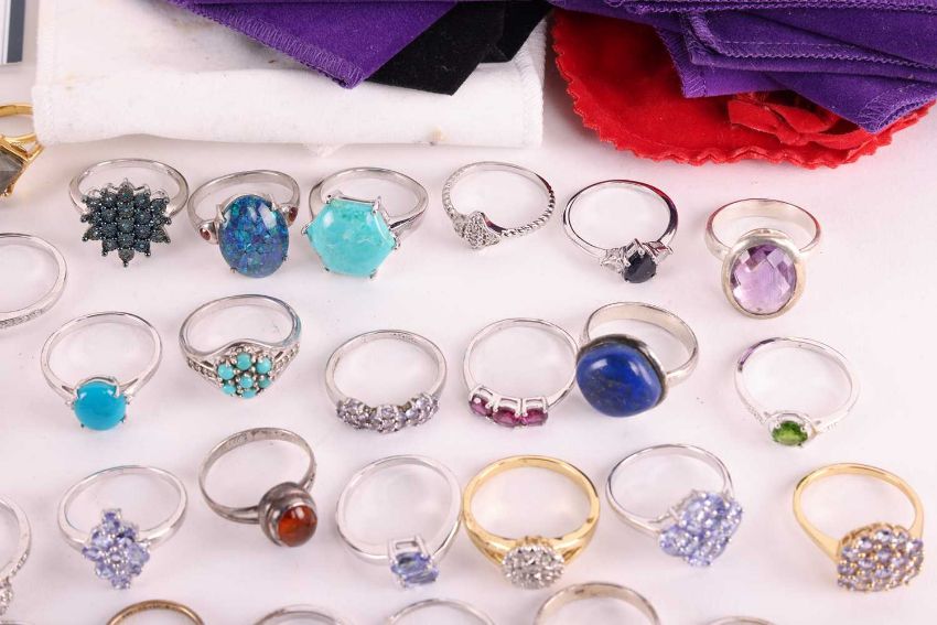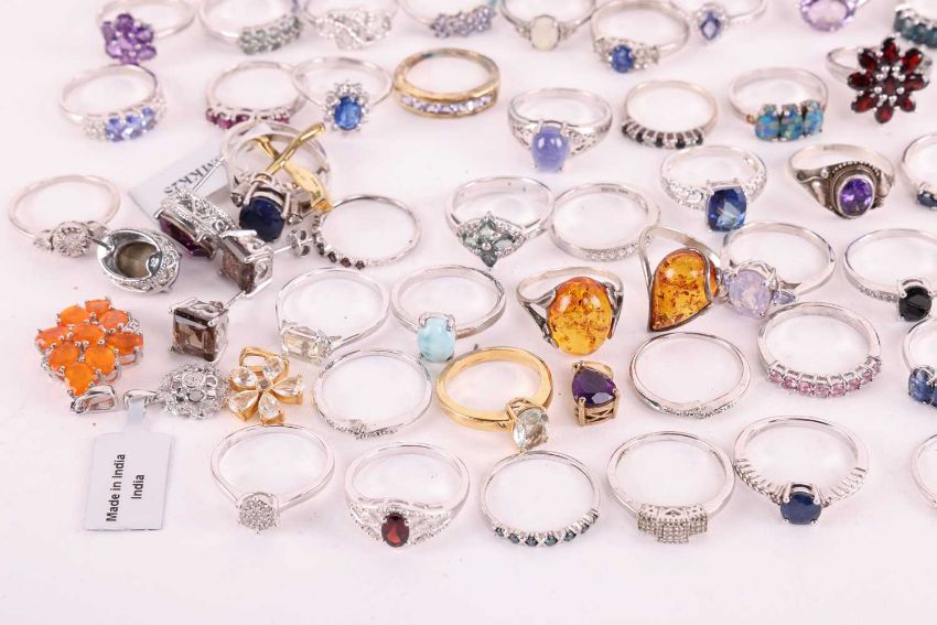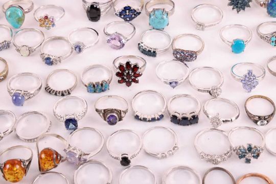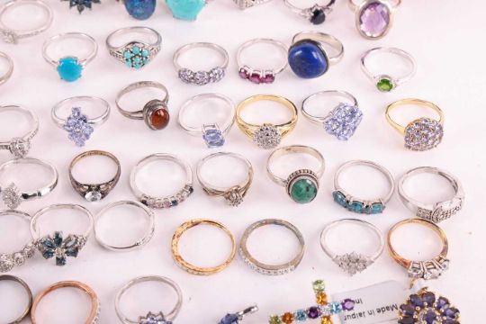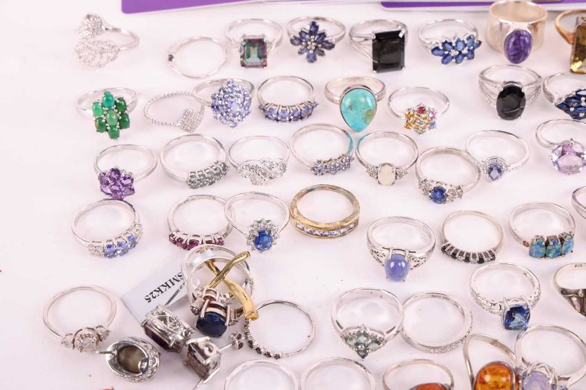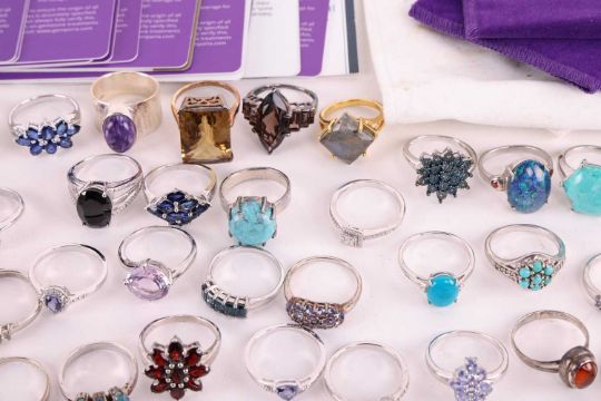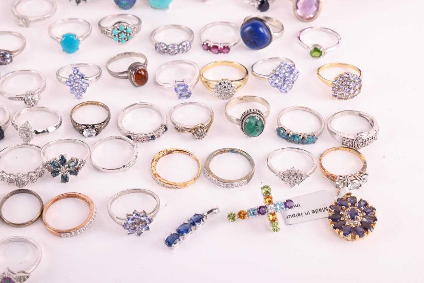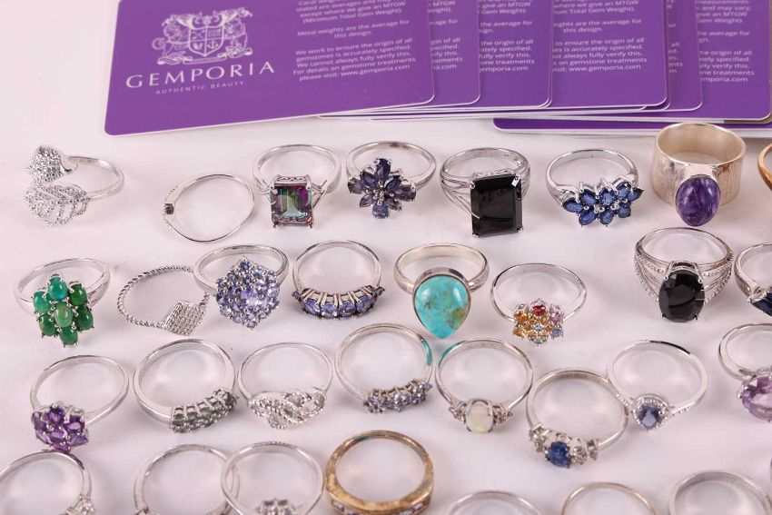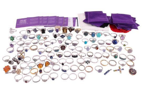 A large group of gem-set rings by Gemporia, marked ‘925’, gem-set with amethyst, mosaic-opal, turquoise, paste and others, as well as numerous pendants and earrings and other rings, accompanied by a number of authenticity certificate cards and pouches; Gross weight of jewellery approximately 391.0 grams.