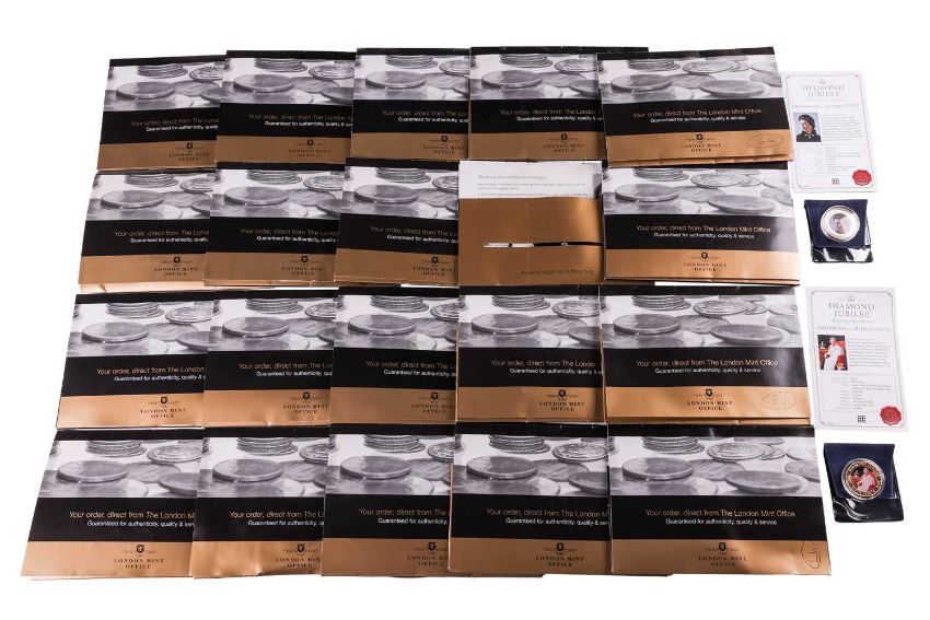 A large group of commemorative coin sets, to include; Michael Collins two-coin set, comprising 20 Euros 2012 gold proof and 10 Euros 2012 silver proof, in the box of issue with certificate, numbered 3811; together with a large quantity of London Mint Office issue commemorative gold plated coins, most with certificates and paperwork, comprising: 2010 William & Catherine Proof Crown, Silver Jubilee Portrait Half Penny, 2011 Maundy Ceremony One Crown, 1936 Year of Three Kings Proof Crown, 2010 QEII 80th Birthday Crown, 2000 QEII Penny, 1967 Half Penny, 2011 William & Catherine Wedding Proof Crown, 2010 VE Day 1945 Crown, 2003 Diamond Jubilee Golden One Pound, 2001 Golden Jubilee Fifty Pence, 2010 Queen Victoria Proof Crown, Silver Jubilee Portrait 20 Pence, Diamond Edition One Penny, 2010 Coronation 1953 Proof Crown, 2011 QEII Oldest Reigning Monarch Crown, 2010 Order of the Garter Crown, 1962 Coronation Portrait One Shilling and 2011 Diamond Jubilee Bailiwick of Guernsey Fifty Pence; 'The Changing Face of Britain's Coinage', variously in cupronickel and bronze with gold plating, the majority of certificates present, comprising: Golden Royal Half Penny, Golden Lion Passant Ten Pence, Golden George VI Royal Cypher Sixpence, 'Wren' Farthing, Golden English Shilling, Golden Scottish Shilling, Golden Tudor Rose Twenty Pence, Golden Crowned Thistle Five Pence, Golden Half Crown, Golden Garland Sixpence, Golden Tudor Rose Florin, Golden One Pound, 1939 'Wren' Farthing, Golden George VI English Shilling, George VI Thrift Plant Threepence, Fleur de Lis Two Pence, Ship Halfpenny, Britannia Fifty Pence, Portcullis Penny, 1967 Britannia Penny and 1957 Threepence; 2011 William in the Military Crown, 2011 Garden Parties Proof Crown, 2011 Head of the Commonwealth Proof Crown, George VI Tudor Rose Florin, George VI Shield Half Crown, 'Coronation Portrait' Sixpence, Diamond Jubilee Cecil Beaton Cook Islands One Dollar, Diamond Jubilee Julian Calder Jersey Fifty Pence, 1952 Accession of Queen Elizabeth Proof Crown, Golden Jubilee Portrait Two Pence, Golden Jubilee Portrait Lion Passant Ten Pence, 1977 Silver Jubilee Crown, 2002 Golden Jubilee Crown, Golden Jubilee Portrait Tudor Rose Twenty Pence, Coronation Portrait Penny, Coronation Portrait Halfpenny, Diamon Jubilee £1, Golden Jubilee Portrait Crowned Thistle Five Pence, Silver Jubilee Portrait Two Pence, George VI Ship Halfpenny, George VI Scottish Shilling, George VI Britannia Penny, and Silver Jubilee Portrait Crowned Thistle Five Pence.