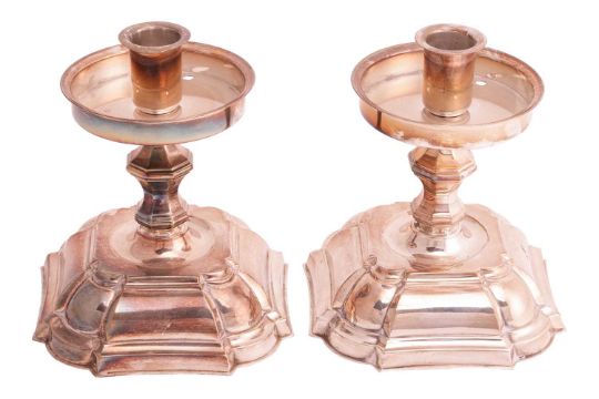 A pair of Danish silver-plated candlesticks, by Hans Jensen & Co., with an octagonal knop and on stepped square foot, detachable loaded bases, 13.0 cm high.
