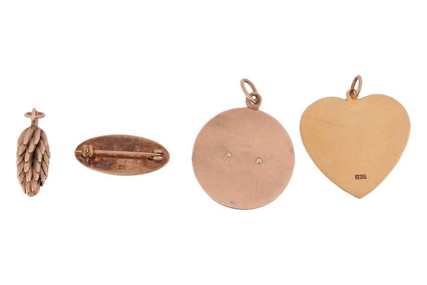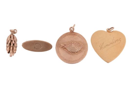 Three pendants and a brooch; to include a heart-shaped pendant with loop bail, engraved the name 'Caroline' in cursive, yellow metal stamped '18ct'; a puffer fish round pendant with engine-turned border in metal stamped '10K'; a banana bunch charm in 9ct gold, British assay marks; and an oval brooch engraved with initial 'C' in metal stamped '9ct'; Total weight of items 21.9 grams. (4)