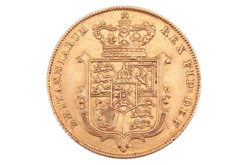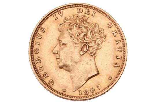 A George IV Sovereign, 1827, obverse shield back and bare head.