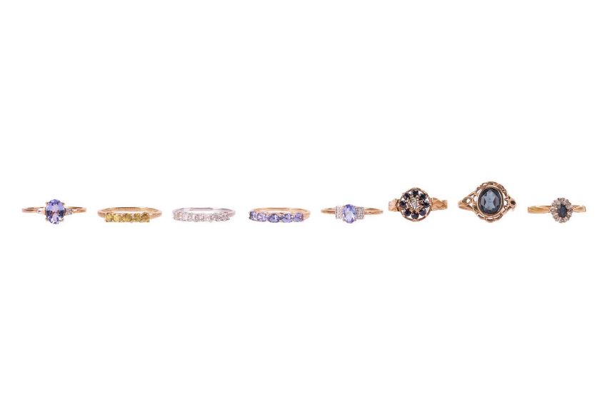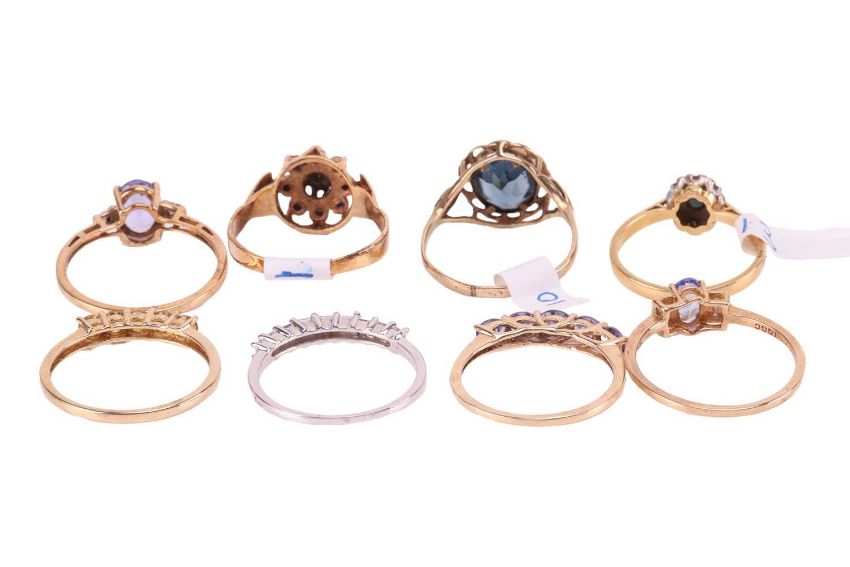 A collection of eight gem-set rings; to include a 9ct white gold princess-cut diamond half-eternity ring in size R½, a 9ct yellow gold tanzanite solitaire in size S, another similar 9ct gold tanzanite ring in size R½, a 9ct tanzanite five-stone ring in size Q, a 9ct gold yellow sphene five-stone ring in size S, a 9ct gold sapphire and diamond floral cluster ring in size S, a 9ct gold blue paste dress ring in size R; all the above struck with British assay marks; together with a sapphire cluster ring with diamond accents in size P, metal marked '18ct'; Total weight of items 16.8 grams. (8)