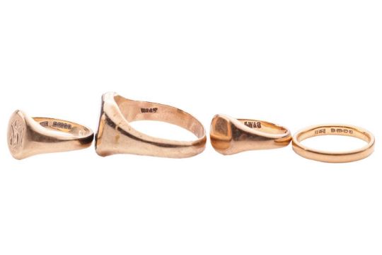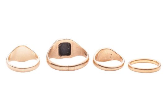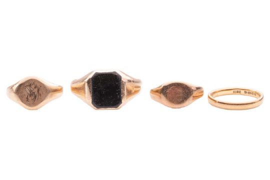 Four rings; comprising a 22ct yellow gold court-shaped wedding band, size K; two 9ct yellow gold signet rings, sizes I1/2 and M1/2; and a 9ct yellow gold onyx-set signet ring, size Y1/2; total weight of items 17.9 grams (4)