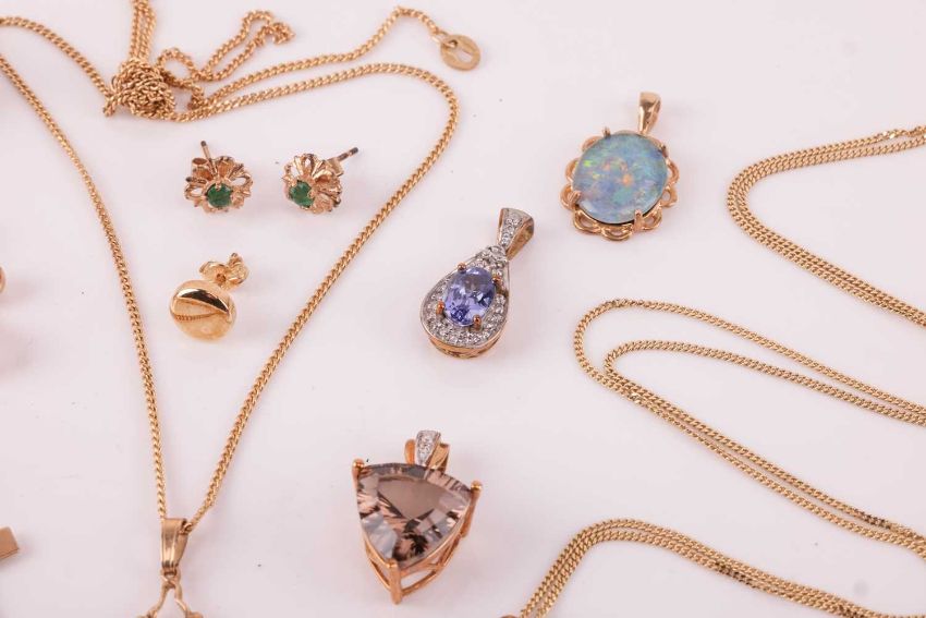 A group of 9ct and yellow metal jewellery; including a 9ct gold cross pendant, an opal triplet pendant, a pair of cultured pearl drop earrings and other pendants, chains and earrings; Gross weight 23.3 grams.