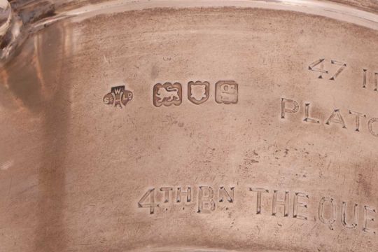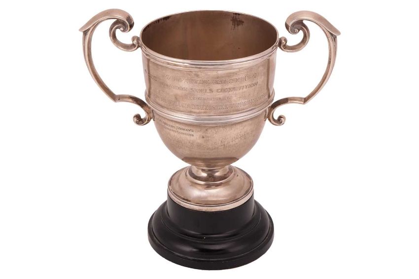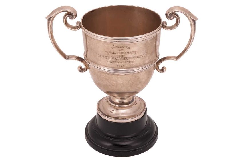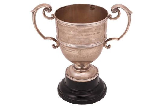A silver East Surrey Regimental two-handled trophy, London 1902, by William Hutton & Sons Ltd, of inverted bell shape with reeded band, with commemorative engraving to both sides, on an ebonised base, 20.0cm high; total weighable: 765.2 grams (24.6 ozt).