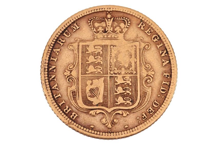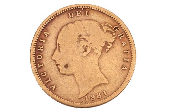 A Queen Victoria half sovereign, 1881, obverse young head with shield back to the reverse.