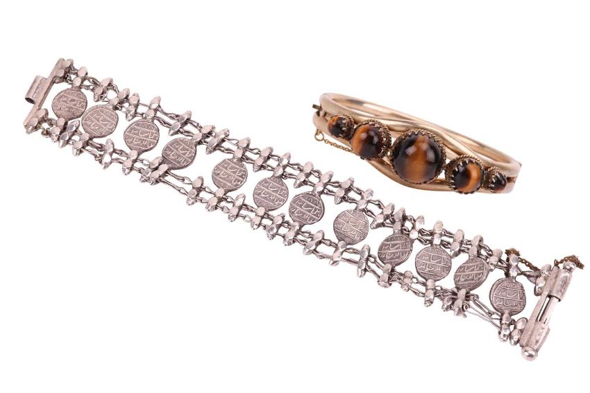 An Indian bracelet and a tiger's eye bangle; the bangle featuring five tiger's eye cabochons in graduating sizes, from 5.5 mm to 14 mm, set within decorative gallery bezels, atop a closed oval bangle, comprised of two rows of hollow wire measuring approximately 4mm each, with tongue clasp, and safety chain, approximately 16 cm inner-circumference, in unmarked gilt metal, weighs 19.9 grams; together with an Indian bracelet of repeating coin and bead links, featuring lion passant design and Arabic script to reverse, connected by wire links, to a hinge clasp, with safety chain, measuring approximately 18cm, in unmarked white metal, weighs 60.4 grams.