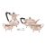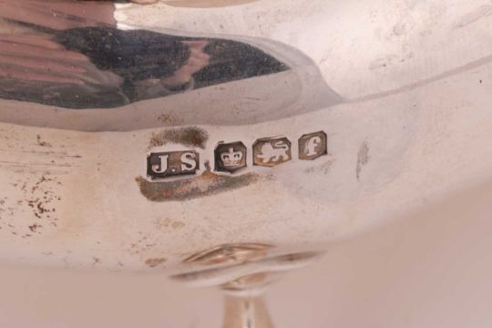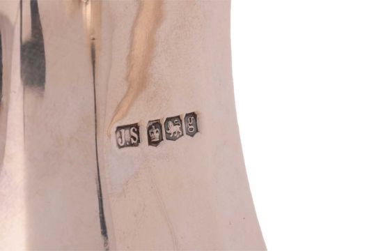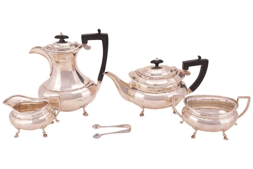 An Art Deco silver four-piece tea service, comprising a hot water jug, a teapot, a sugar bowl, a creamer and a pair of associated sugar tongs; the hot water jug and teapot with ebonised handles and knops, all on four hoofed feet, Sheffield 1923/1924, maker's mark for Stevenson & Law; Total weight of items 1975.1 grams (63.50 ozt). (5)