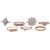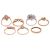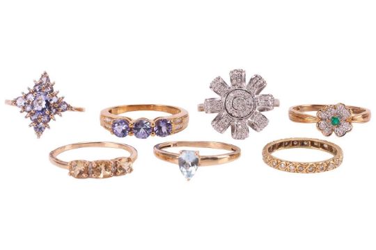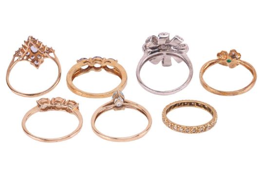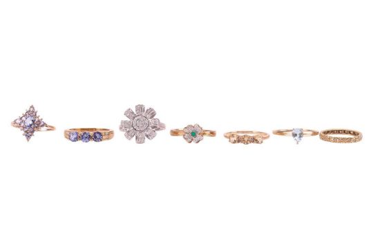 A collection of seven gem-set rings; to include a single-cut diamond eternity ring, in yellow metal testing as 18ct, size N; a 9ct gold tanzanite three-stone ring in size S; a 9ct gold tanzanite lozenge cluster ring in size S½; a 9ct gold pear-cut aquamarine ring in size S; a shamrock diamond and agate cluster ring in size S; a topaz three-stone ring in size S; and a diamond flowerhead ring in white metal marked '925', size S; (7) Total weighable 13.3 grams.