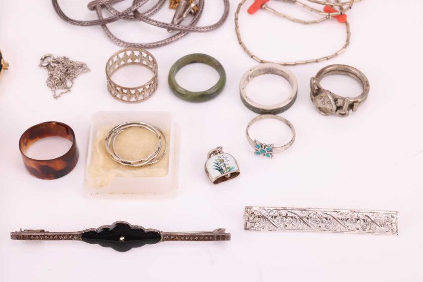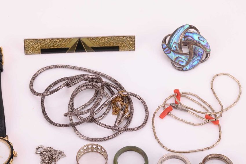 A group lot of jewellery and watches, to include a broken yellow metal chain testing as 14ct, two white metal chains, an enamelled white metal bell pendant, four white metal brooches, nine rings and five fashion watches, including an example by Tissot and Calvin Klein; Total weight approximately 170.5 grams