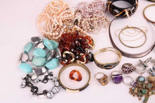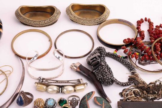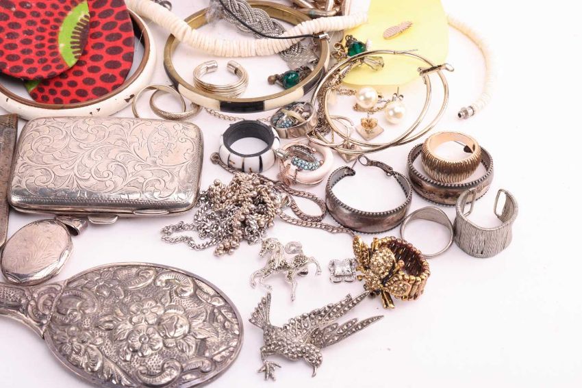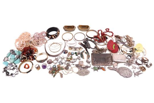A large quantity of silver and costume jewellery to include; an Art Nouveau silver-edged leather card holder with hallmarks for Birmingham 1907-8, makers mark Henry Marshall & Sons; a silver cigarette case, with engraved scrollwork design, and hallmarks for Brimingham 1902-3; 53.8 grams; a 9ct gold watch (without strap), gross weight 12.1 grams; a pair of Indian brass trinket dishes; together with a group of freshwater and imitation pearl necklaces, paste-set pieces and a quantity of marcasite and silver jewellery.