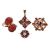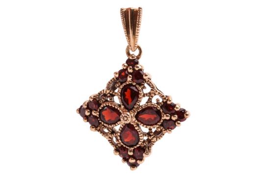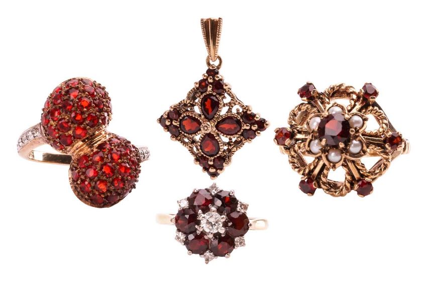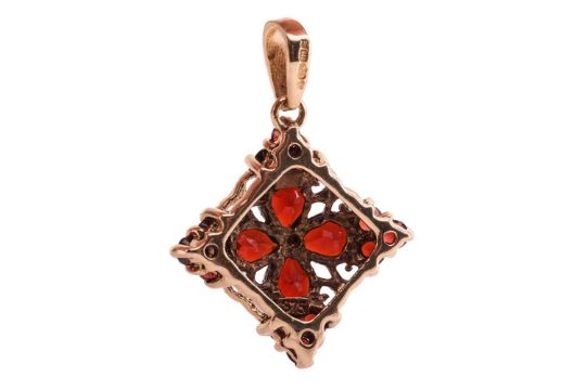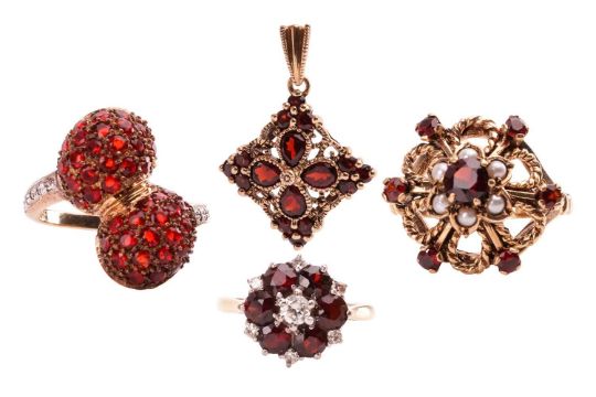 A small collection of gem-set jewellery items; to include a garnet and diamond floral cluster ring in 18ct yellow gold, size L; a floral cocktail ring set with garnet and split pearls in 9ct yellow gold, size P; a garnet cluster lozenge pendant in 9ct gold; and a fire opal cluster dress ring in 9ct yellow gold, size O; Total weight of items 15.3 grams (4).