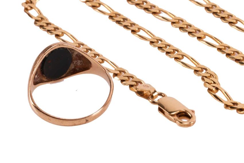A figaro link chain, of flattened links to a lobster clasp, in yellow metal with British hallmarks for 9ct, 52.0cm in length, 10.0 grams; together with a bloodstone signet ring, with a central polished oval bloodstone of 9.8mm x 7.5mm, set in yellow metal stamped "9", testing as 9ct, size M 1/2, 2.2 grams.