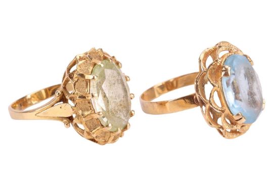 Two gem-set dress rings; The first ring featuring a green oval-cut synthetic spinel measuring 14.0mm x 10.0mm x 5.2mm, claw-set in a yellow metal mount with pierced gallery, to a yellow metal ring shank testing as 18ct, size O ½; The second ring featuring a blue oval-cut paste measuring 14.0mm x 10.0mm x 5.9mm, claw-set to a stylised-foliate openwork mount, to a yellow metal ring shank testing as 18ct, size Q ½; Gross weight 9.7 grams.