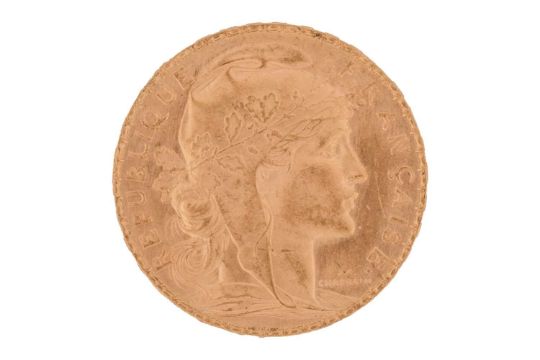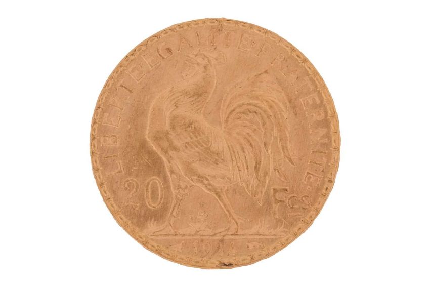 A France 1914 gold 20 Francs coin with Marianne wearing the Phrygian cap on the obverse, and a cock on the reverse.