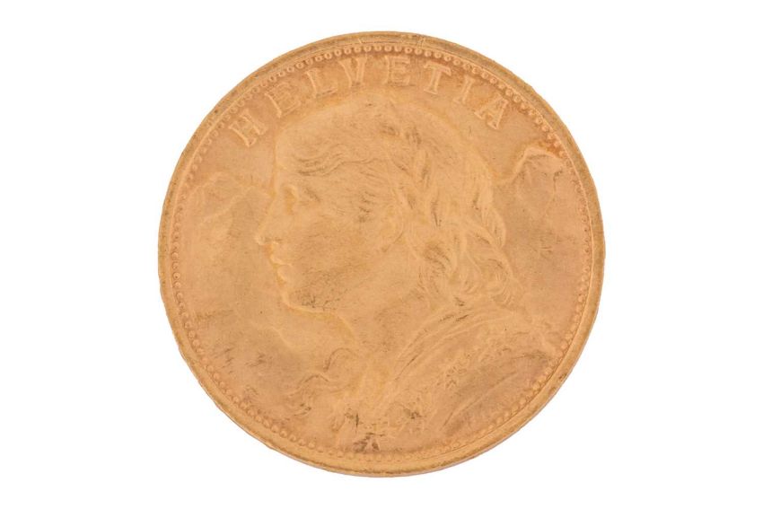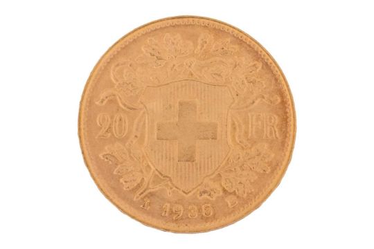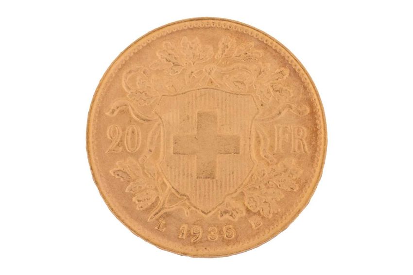 A Switzerland 1935 gold 20 Francs coin with Helvetia facing left, Swiss Cross in shield on the reverse.