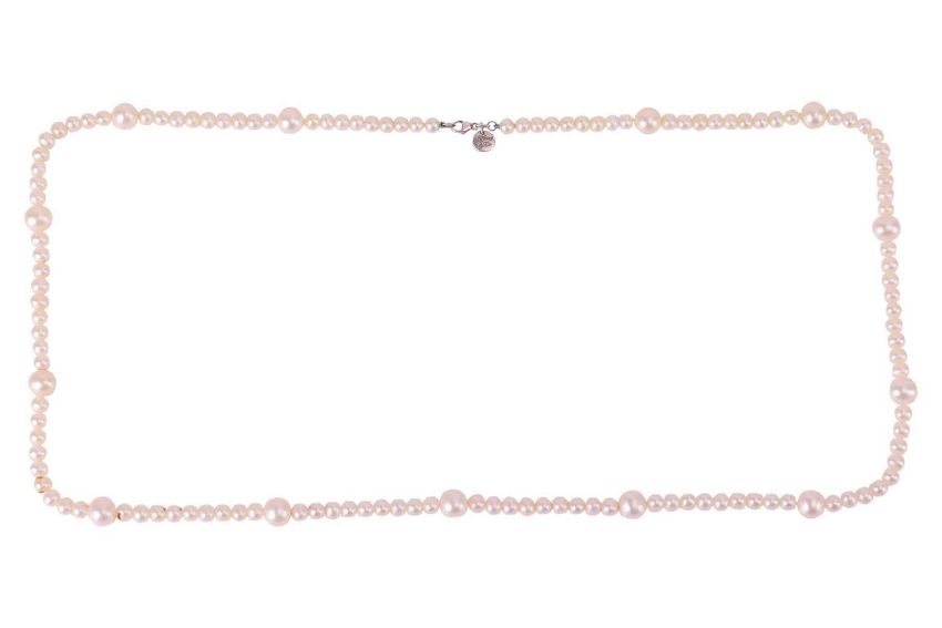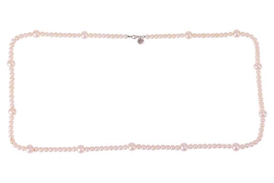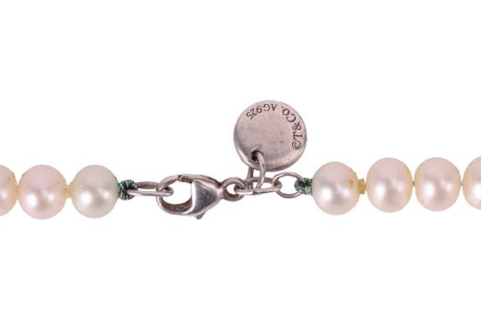 Tiffany & Co. - A cultured pearl necklace, comprising a row of potato-shaped cultured pearls of 6.0mm, interspersed with thirteen larger spacers of 8.8mm, completed with a lobster clasp and a signed plaque, white metal marked 'AG925', overall length 77.0 cm.