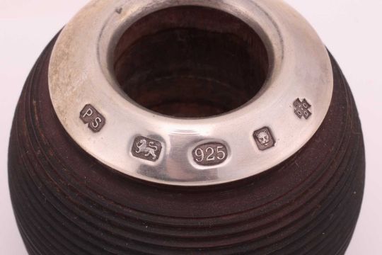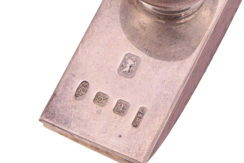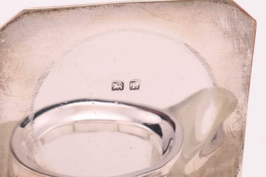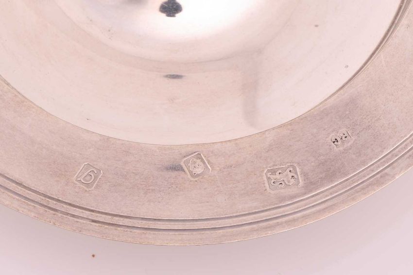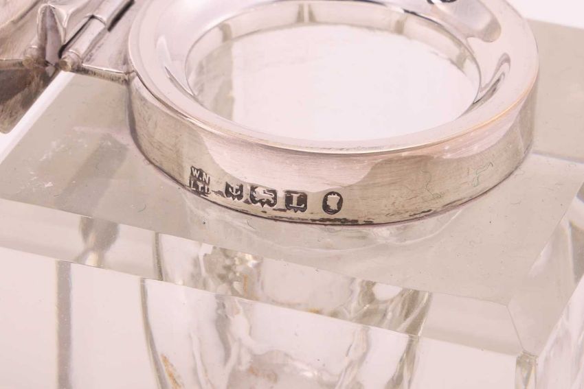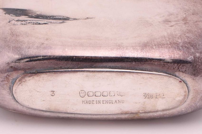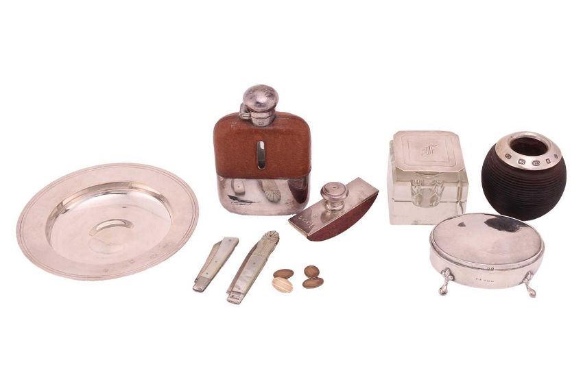 An armada dish, London 1962, 14.5cm diameter; a silver mounted glass inkwell, with monogram engraved, hinged cover, Birmingham 1935, by William Neale and Son; a silver mounted wooden vesta, with millennium hallmarks, a silver mounted blotter, an oval silver trinket box, two mother-of-pearl mounted silver fruit knives and a pair of '9ct gold on silver' cufflinks; together with a silver plated hip flask with pull-off beaker; 192 grams (6.1ozt) weighable.