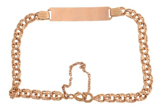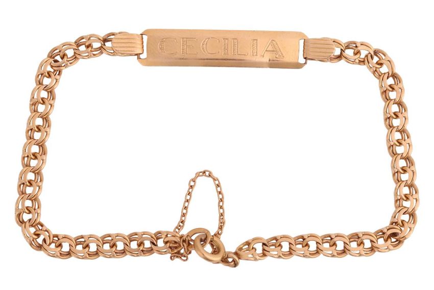An engraved ID bracelet, the bevelled rectangular plaque engraved with the name 'Cecilia', connected to a fancy figure-of-eight link chain with spring-ring clasp, Spain lion head assay mark for 750 (1934-1988), overall length 20.0 cm, 10.0 grams.