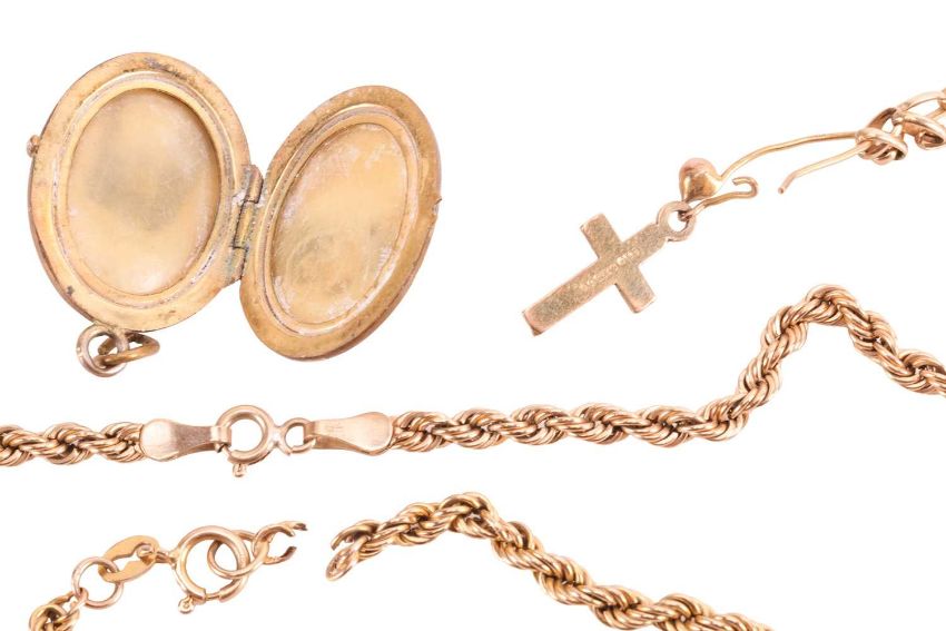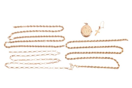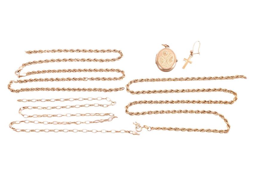 A mixed lot of jewellery items including two 9ct gold rope link necklaces, both broken in one place, a broken cable link chain, in yellow metal tested as 9ct gold, a single 9ct gold cross earring and a base metal locket; Total weighable 10.6 grams.