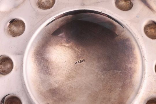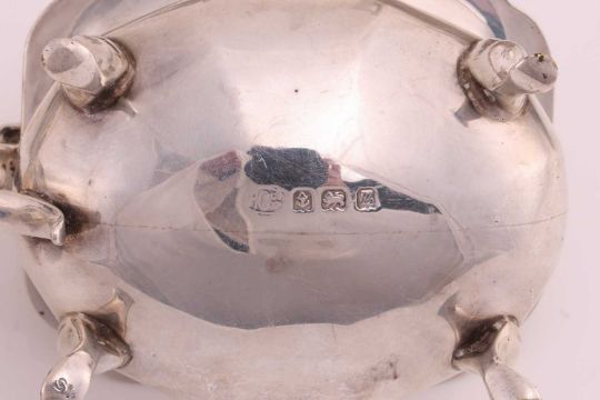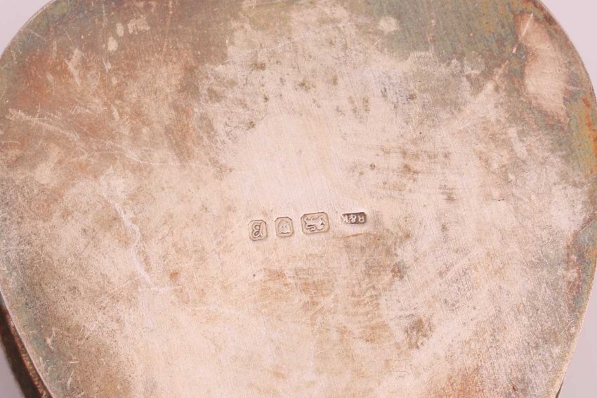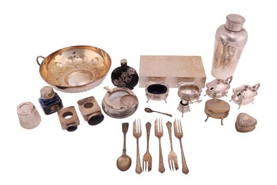 A collection of small items of silver; including a miniature (imported) Dutch Toy mangle tub and mangle, 5.5 cm high; a heart-shaped marriage box; pastry forks; cigarette box; two modernist Taxco silver finger scents; large silver plated taste in; cocktail shaker and other items; weighable silver 634.5 grams (20.4 ozt).