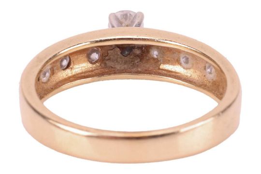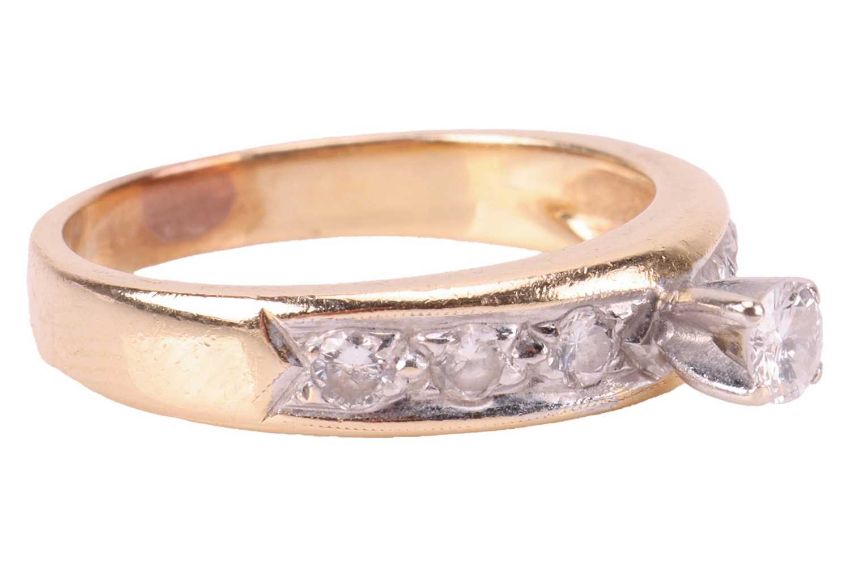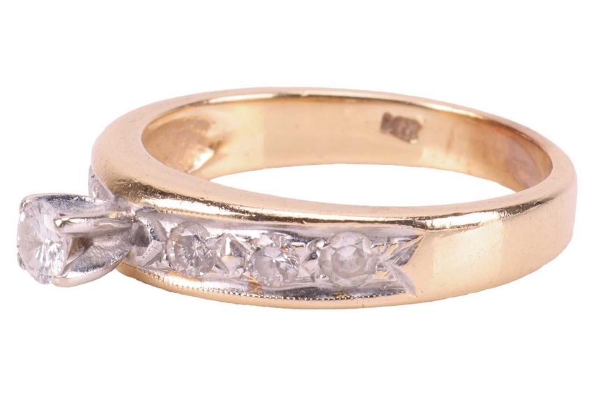 A diamond-set ring, featuring a round brilliant cut diamond with an estimated carat weight of 0.15ct, claw-set in a raised setting, to diamond-set shoulders with millegrain detailing, giving a total estimated carat weight of 0.33ct, in a bi-colour metal mount marked '14K', size M1/2; 3.6 grams