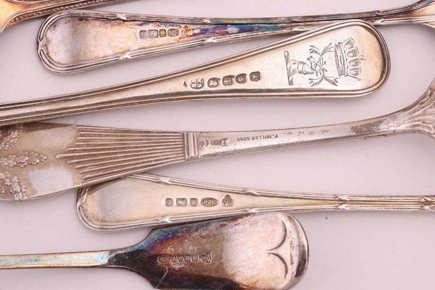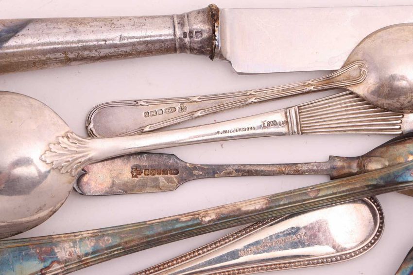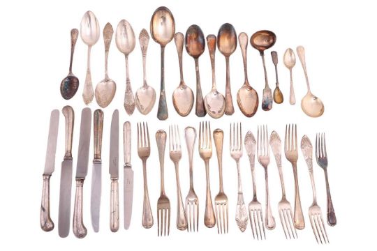 A group of seven German .800 standard table forks, 584.7grams (18.8 ozt); six English 19th century silver table forks and other silver flatware, 727.8 grams (23.4 ozt); and other silver plated flatware, combined weight of marked silver 1312.5 grams (42.2 ozt).