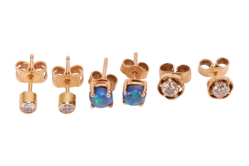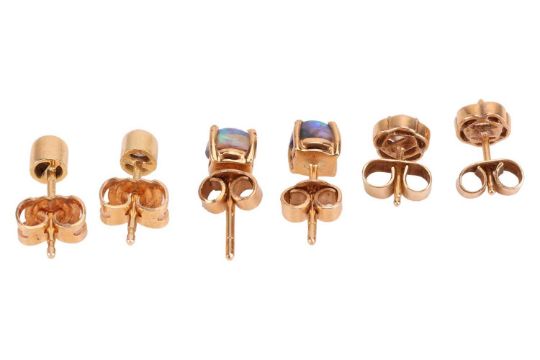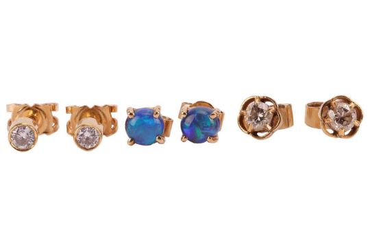 Three pairs of gem-set earrings; comprising a pair of diamond stud earrings in 18ct yellow gold; a pair of diamond-set floral stud earrings in unmarked yellow metal testing as 18ct; and a pair of 5.0mm dark opal cabochon stud earrings in unmarked yellow metal testing as 18ct; Total weight of items 4.2 grams (3).