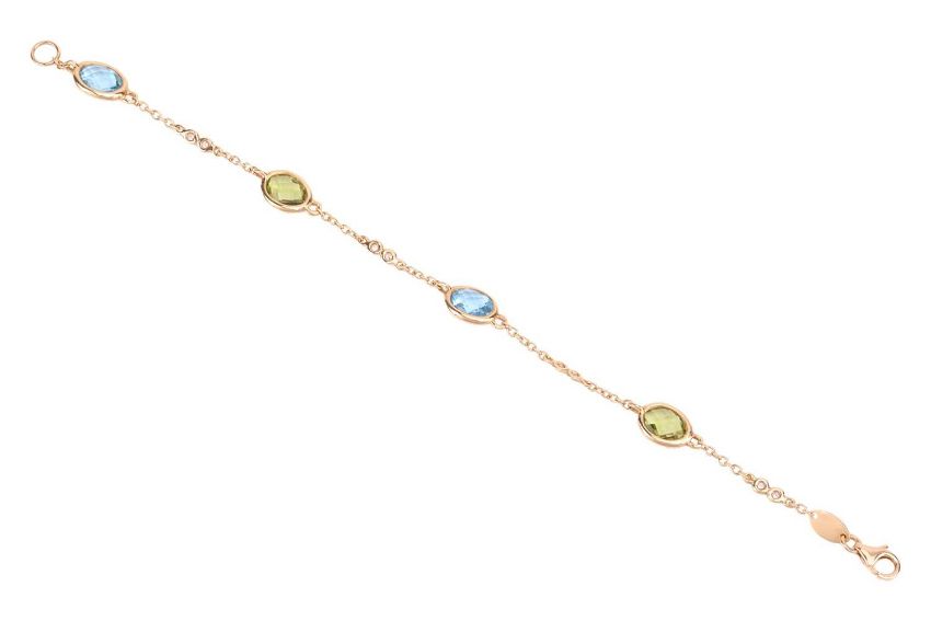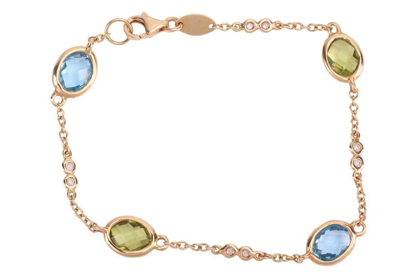 A gem-set bracelet by Kiki McDonough, comprising a cable link chain, alternating with spectacle-set chequerboard-cut blue topaz and peridot, and diamond accent spacers, yellow metal struck with Italian assay marks '750', maker's mark 'KMcD', 18.0 cm in length, 5.0 grams.