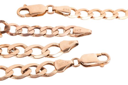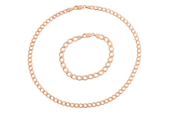A flattened curb link necklace and bracelet set; the necklace of 43.0cm, to a lobster clasp, and a matching bracelet of 20.0cm, to a lobster clasp, both with British hallmarks for 9ct, Total weight 20.2 grams (2).