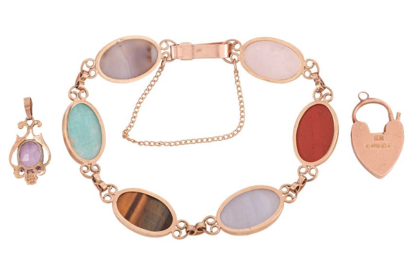 A hardstone bracelet set with lace agate, carnelian, rose quartz and tigers eye cabochons, stamped 9ct to the clasp; together with an amethyst set pendant hallmarked for 9ct gold; and a heart padlock pendant with hallmarks for 9ct gold to the reverse, gross weight 20.8g. (3)