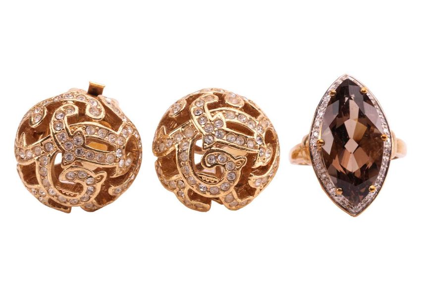 A mixed lot of gem-set jewellery items, comprising a smoky quartz dress ring, the marquise-cut smoky quartz measuring approximately 20.2mm x 10.0mm, in a diamond-set surround, to a 9ct yellow gold mount, size L; a smoky quartz drop pendant in yellow metal marked '375'; a multi gem-set bracelet, featuring oval-cut amethysts, citrines, garnets, peridots and topaz in 9ct yellow gold mounts; a multi gem-set cluster drop necklace, in 9ct yellow gold; a multi gem-set cross pendant and a pair of Christian Dior earrings of domed scrolling design; 30.0 grams (6).