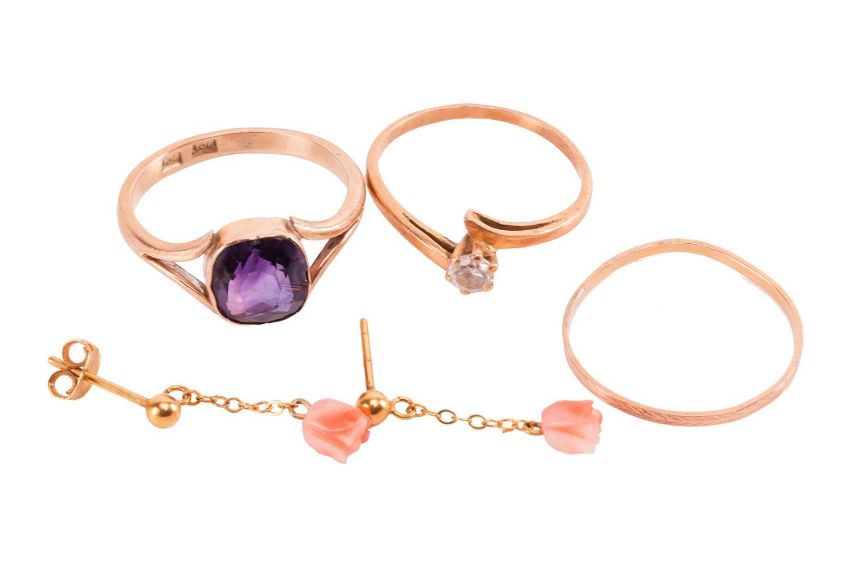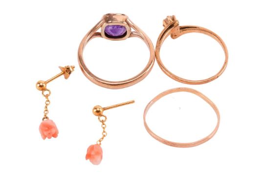 A small group of jewellery items including an amethyst-set dress ring, in yellow metal marked '9ct', size R, a cultured pearl necklace with a yellow metal clasp marked '585', a stylised double drop pearl pendant tested as 14ct gold, a yellow metal band and a CZ solitaire ring, both tested as 18ct gold, and a pair of coral-set drop earrings, depicting roses, in yellow metal tested as 18ct gold; Total weighable 9.1 grams (6).