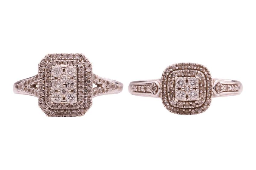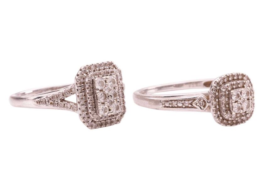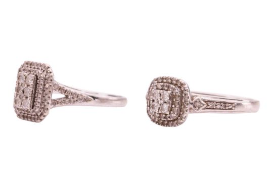 Two diamond-set dress rings; comprising a diamond-set cluster ring of rectangular form, with an estimated total carat weight of 0.50ct, the central panel set with eight round brilliant diamonds and surrounded by two diamond-set rows, to diamond-set bifurcated shoulders, in a white metal mount marked '375', size N1/2; together with a similar cluster ring of cushion-shaped form, with an estimated total carat weight of 0.30ct, in a 9ct white gold mount, size P; 5.8 grams (2).