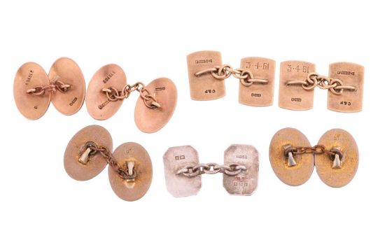 A group of cufflinks, comprising two pairs of 9ct gold cufflinks with a combined weight of 17.0 grams, a pair of yellow metal cufflinks with enamel detail, testing as base metal and a single silver cufflink weighing 5.8 grams; Gross weight 32.3 grams (5).