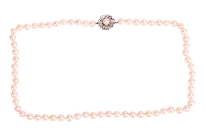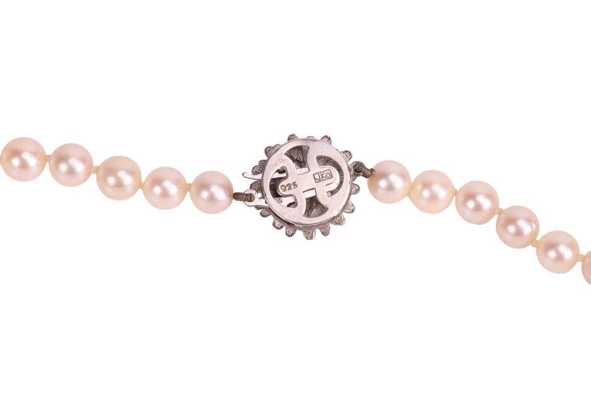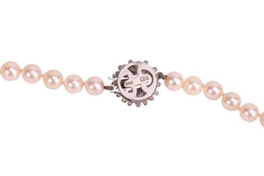 A single-strand cultured akoya pearl necklace, the pearls of cream body with pinkish overtones, measuring approximately 6mm-6.5mm each, leading to a floral pearl-set white metal clasp, marked 'JKa' '925', measuring approximately 45cm long, in a branded Mikimoto box; 25.2 grams