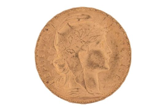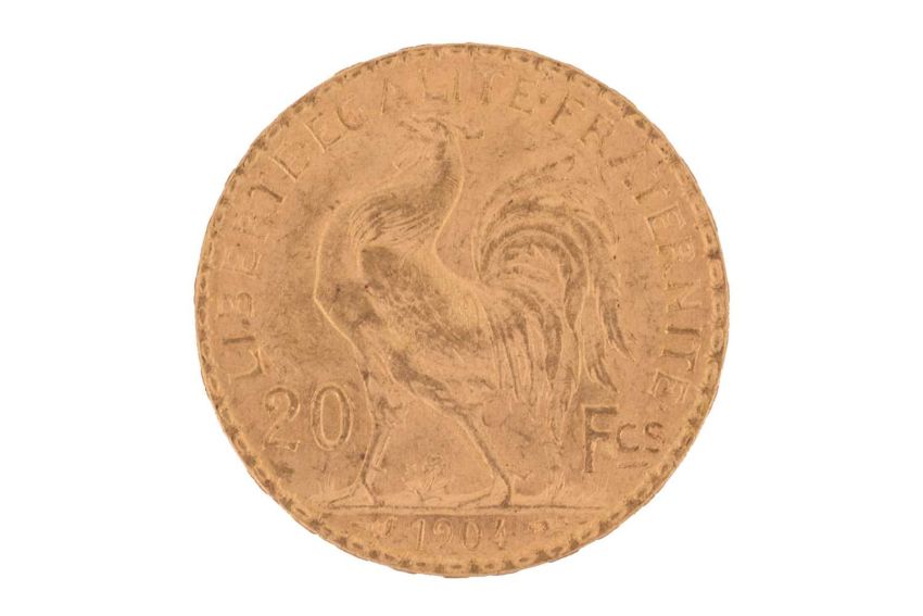 A France 1904 gold 20 Francs coin with Marianne wearing the Phrygian cap on the obverse, and a cock on the reverse.