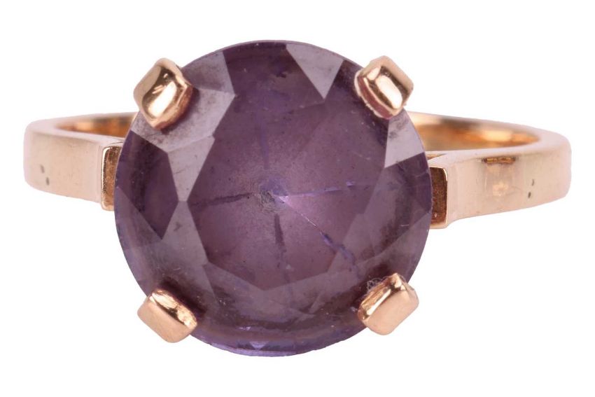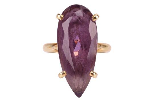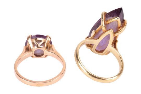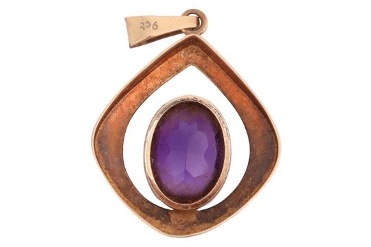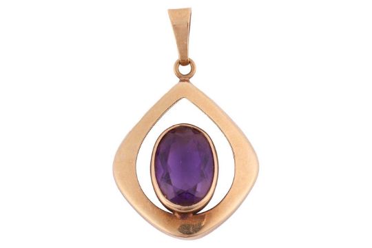 A group of gem-set jewellery, comprising a pear-shaped amethyst ring of 2.32cm x 1.00cm x 8.00cm, claw-set in yellow metal testing as 18ct, size J; an oval-cut amethyst pendant, the amethyst measuring 1.20cm x 0.90cm x 0.56cm, encircled by a curved lozenge-shaped border of yellow metal, the bale marked ‘9ct’, pendant length including bale 3.5cm; a brilliant-cut synthetic colour-change sapphire ring, the synthetic sapphire measuring 0.98cm x 0.98cm x 0.52cm, claw-set in yellow metal stamped with Egyptian seagull mark and testing as 18ct, size J ½; Gross weight 11.7 grams (3).