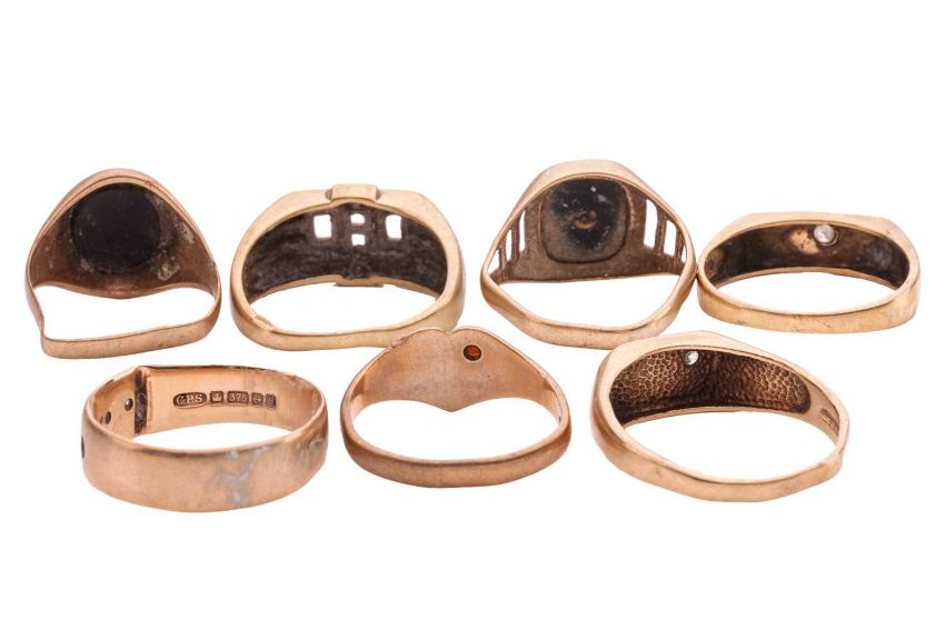 A group of 9ct gold rings, to include two signet rings set with cubic zirconia, with Birmingham hallmarks, a "DAD" ring, set with two single cut diamonds, with Sheffield hallmarks; a ring with an onyx plaque with overlayed "DAD" motif and pierced shoulders; a signet ring set with an oval onyx plaque; a heart-shaped ring with a star-set garnet; and a band set with a single garnet (three stones defficient), all with British hallmarks for 9ct; Total weight 21.7 grams (7).