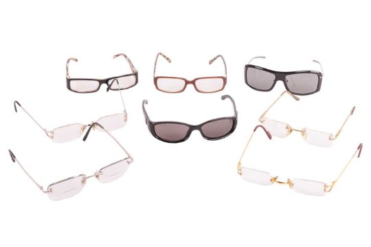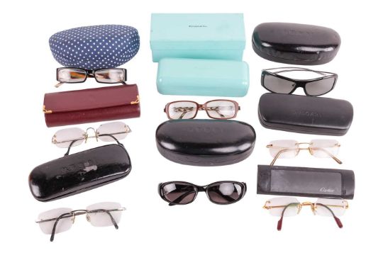 A collection of designer eyewear; to include examples of two pairs of cased Cartier glasses with C de Cartier motifs, one in silver-tone and another in gold-tone frame; two pairs of cased Gucci oversized sunglasses; a pair of cased Tiffany & Co. square glasses in brown etc. (8)
