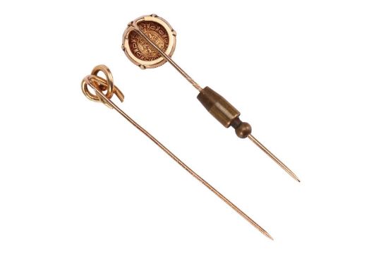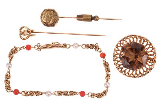 A small collection of jewellery items; to include a large octagonal-cut smokey quartz brooch cum pendant, set to wired surround with integral bail and brooch fittings, yellow metal struck with Egyptian assay marks for 18ct, 3.3 cm wide; a fancy link chain with cultured pearl and coral bead spacers, completed with a tube clasp, Egyptian assay marks for 18ct, 20.5 cm; a Stafford knot stickpin with pearl accent, in yellow metal struck with French eagle head assay mark for 18ct; a Charles III of Spain 1786 half Escudo stickpin, mounted to fittings testing as 18ct; Total weight of items 31.9 grams (4).
