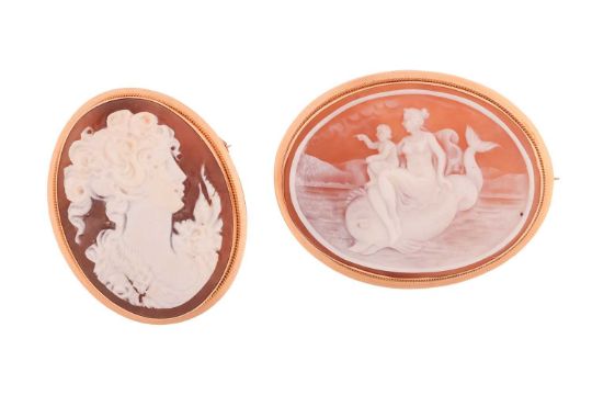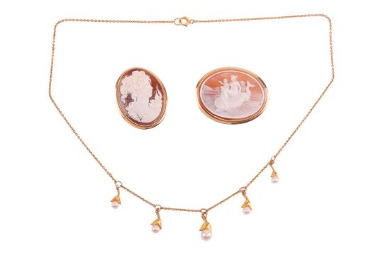 A small group of jewellery items, comprising; a pearl-set necklace, in yellow metal marked '9ct'; an oval shell cameo brooch-cum-pendant in yellow metal marked '750', depicting a lady's portrait; and a shell cameo brooch in yellow metal stamped '750', depicting a classical nautical scene; gross weight 13.7 grams (3).