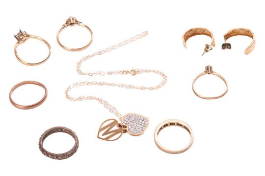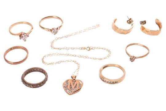A group of paste and cubic zirconia set jewellery, to include; a 9ct gold heart shaped pendant on chain, with a paste-set heart-shaped pendant, with overlayed "M" design in yellow gold with British hallmarks, to a trace chain of oval links with C-spring clasp in yellow metal stamped '375'; a 9ct gold ring set with a princess cut cubic zirconia of 5.0mm, to a crossover band, with British hallmarks, size Q; a 9ct gold ring with eight round brilliant cut diamonds of 1.5mm-2.0mm, channel set to a square edged band with British hallmarks, size O 1/2; a 9ct gold solitaire ring set with a single paste of 3.5mm, to a yellow gold band with British hallmarks, size N 1/2; a 9ct rose gold wedding band with British hallmarks, size O (misshapen); a solitaire ring set with a round brilliant cut cubic zirconia of 5.0mm, to a band of unmarked yellow metal testing as 9ct, size Q; an eternity ring, set with paste, in unmarked yellow metal testing as 9ct, size N; and a pair of faceted hoop earrings, with post and butterfly fittings in unmarked yellow metal testing as 9ct; Total gross weight 14.1 grams (8).