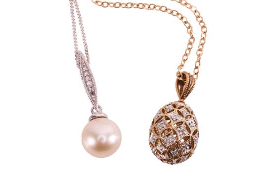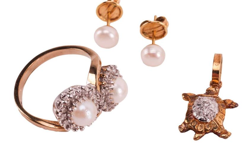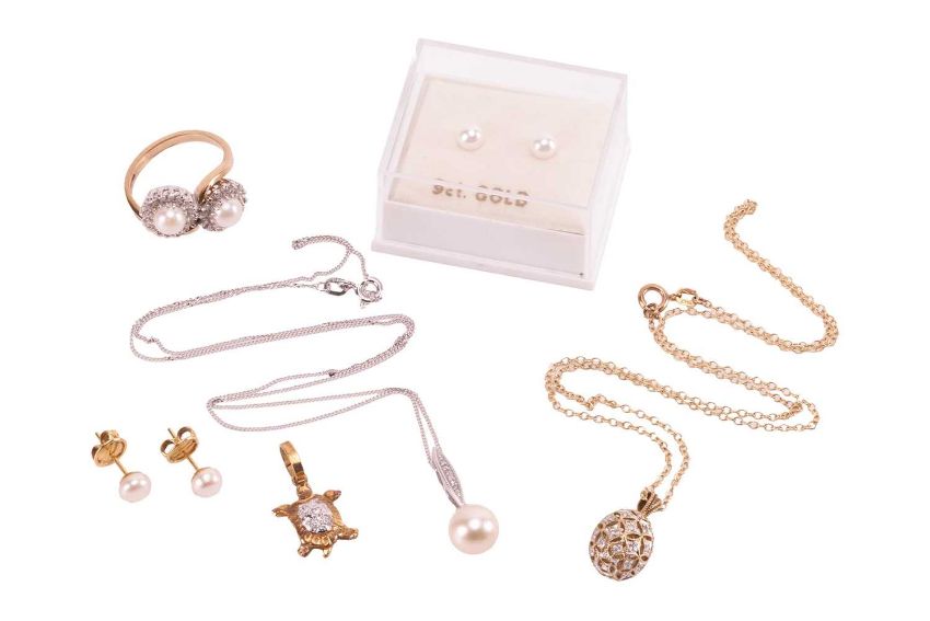 A collection of pearl-set jewellery items; including a 9ct crossover ring set with two half pearls, with diamond set halos, to a yellow gold band with British hallmarks, size O; together with a pendant on chain, featuring a cultured pearl of 8.6mm to a diamond set drop, in white metal stamped "375"; and a pair of cultured pearl stud earrings in unmarked yellow metal testing as 9ct; a diamond-set openwork egg pendant in yellow metal stamped "9K" to a trace chain, stamped "ITALY 375"; total weight 10.9 grams; together with a diamond set turtle pendant in yellow metal stamped "585" weight 1.6 grams; and a pair of cultured pearl stud earrings with yellow metal posts and butterfles stamped "750", weight 1.2 grams.