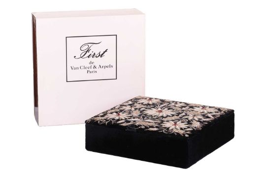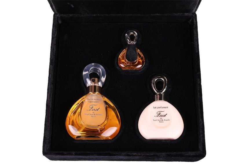 Van Cleef & Arpels - Fragrance First gift set, including a bottle of body milk, a bottle of eau de toilette spray, and a bottle of perfume, boxed in an embroidered and fitted case with signed exterior box.