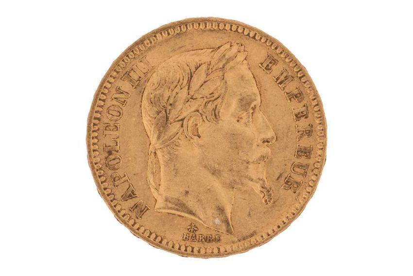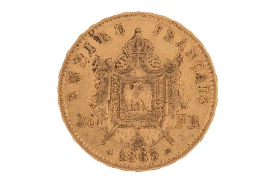 A France 1863 gold 20 Francs coin, with Napoleon III laureate head to the right, imperial coat of arms to the reverse.